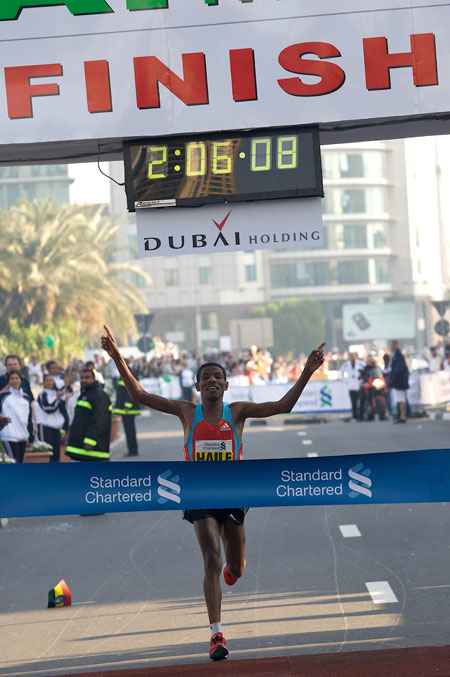 Haile Gebrselassie wins the 2010 Standard Chartered Dubai Marathon in 2:06:09